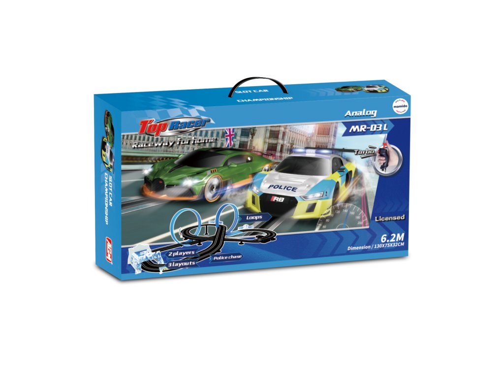 Erleben Sie spannende Rennen mit der Top Racer Autorennbahn von 6,2 Metern Länge, die Action direkt in Ihr Wohnzimmer bringt! Das Set enthält zwei detailreich gestaltete Fahrzeuge – ein Sportwagen und ein Polizeiauto, sodass Sie sich auf eine ordentliche Verfolgungsjagd einlassen können.