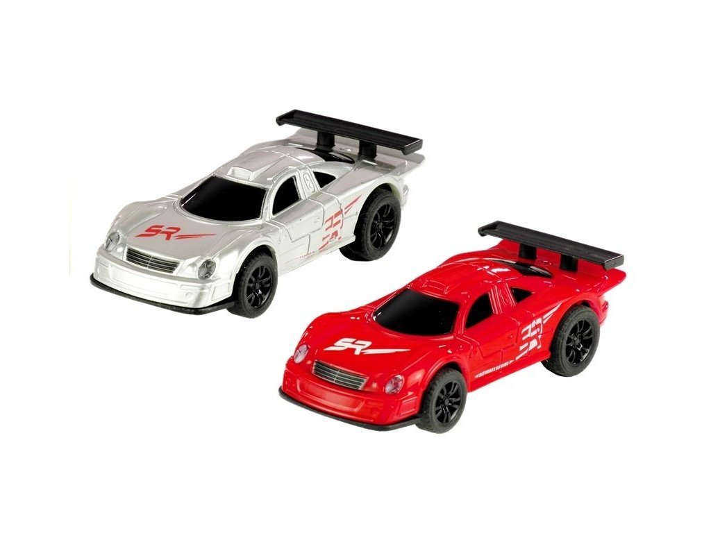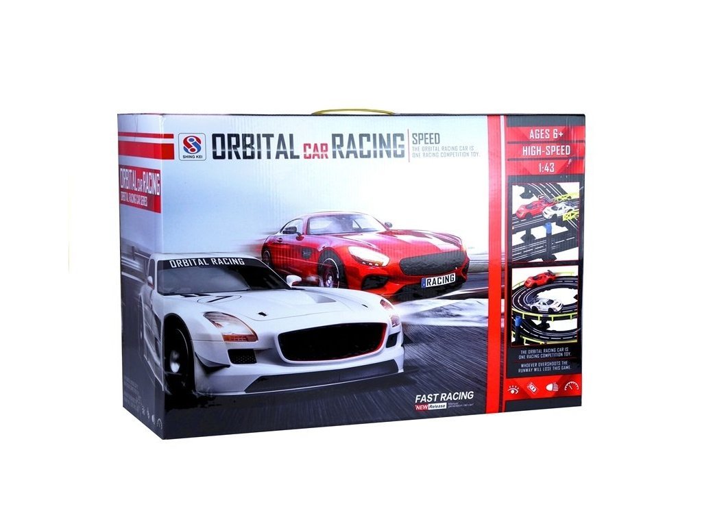 Eine große Rennstrecke besteht aus scharfen Kurven, Achten und 360-Grad-Schleifen. Im Lieferumfang sind zwei Autos im Maßstab 1:43 enthalten, die Leuchteffekte haben. Das Paket enthält zwei Controller, die für die Fahrt und Geschwindigkeit der Autos verantwortlich sind.