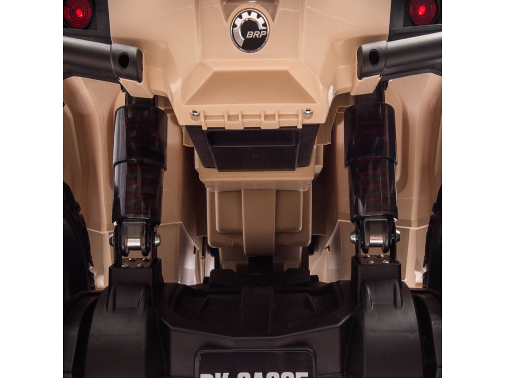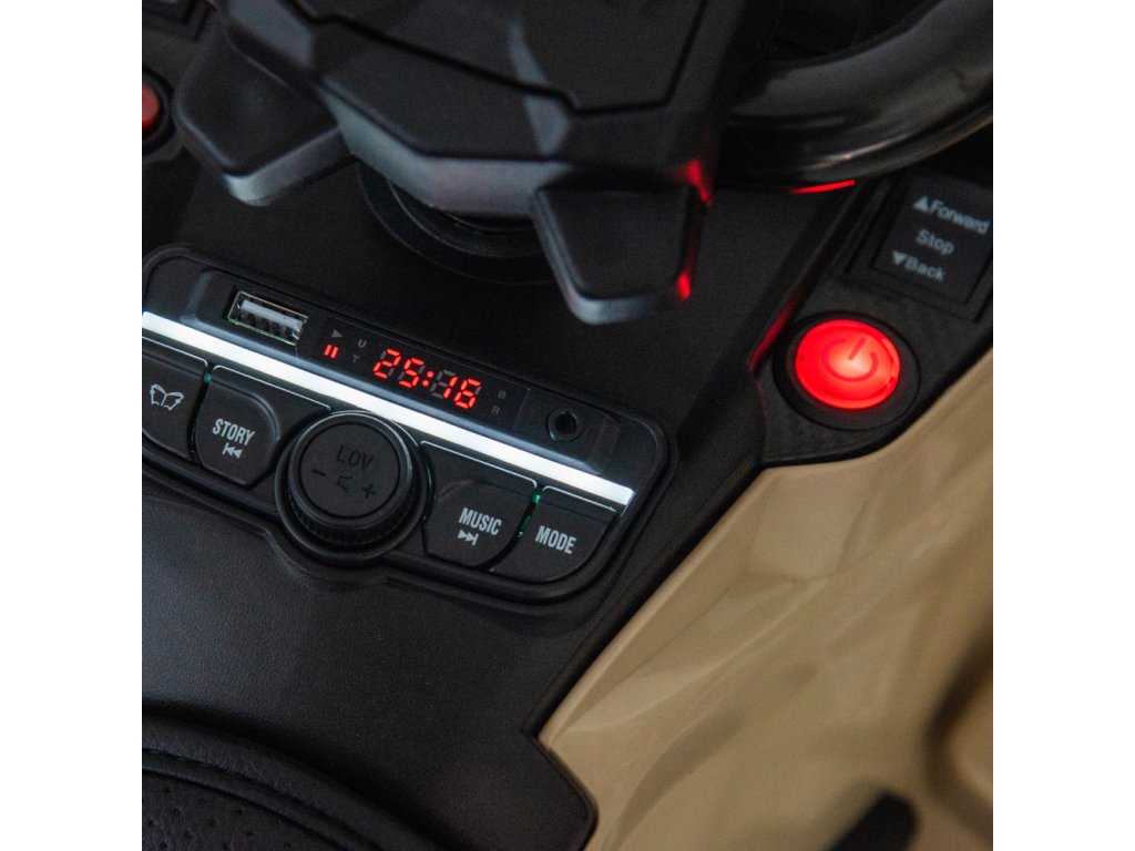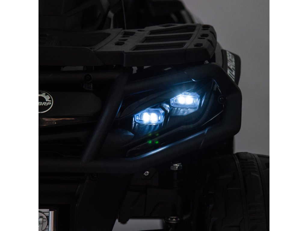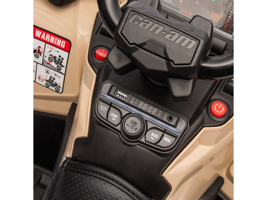 Zur Ausstattung gehört ein Musikpanel mit Eingängen USB, MP3, Radio, AUX, Bluetooth und vorinstallierten Melodien. Das ATV Quad verfügt über Vorder- und Rücklichter, ermöglicht Fahrten in alle Richtungen und hat eine Tragfähigkeit von bis zu 50 kg.