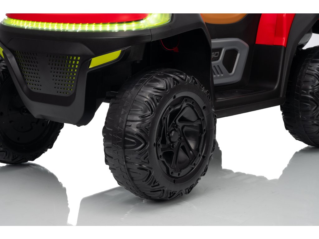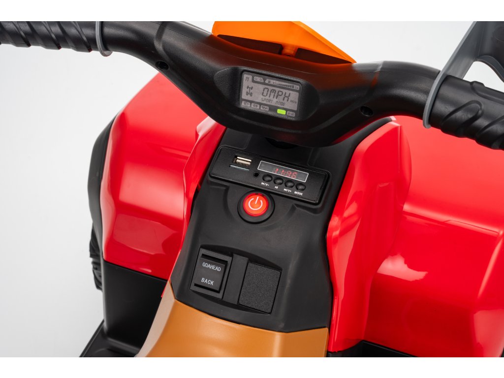 Zur Ausstattung gehört ein Musikpanel mit Eingängen USB und MP3. Das Quad verfügt über vordere und hintere LED-Leuchten, ermöglicht die Fahrt in alle Richtungen und seine Tragfähigkeit beträgt bis zu 30 kg.