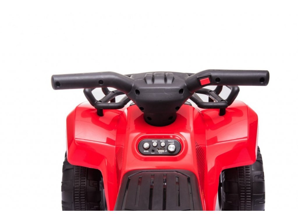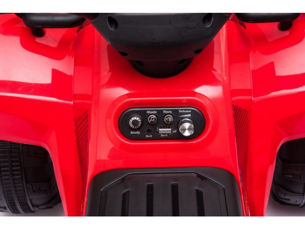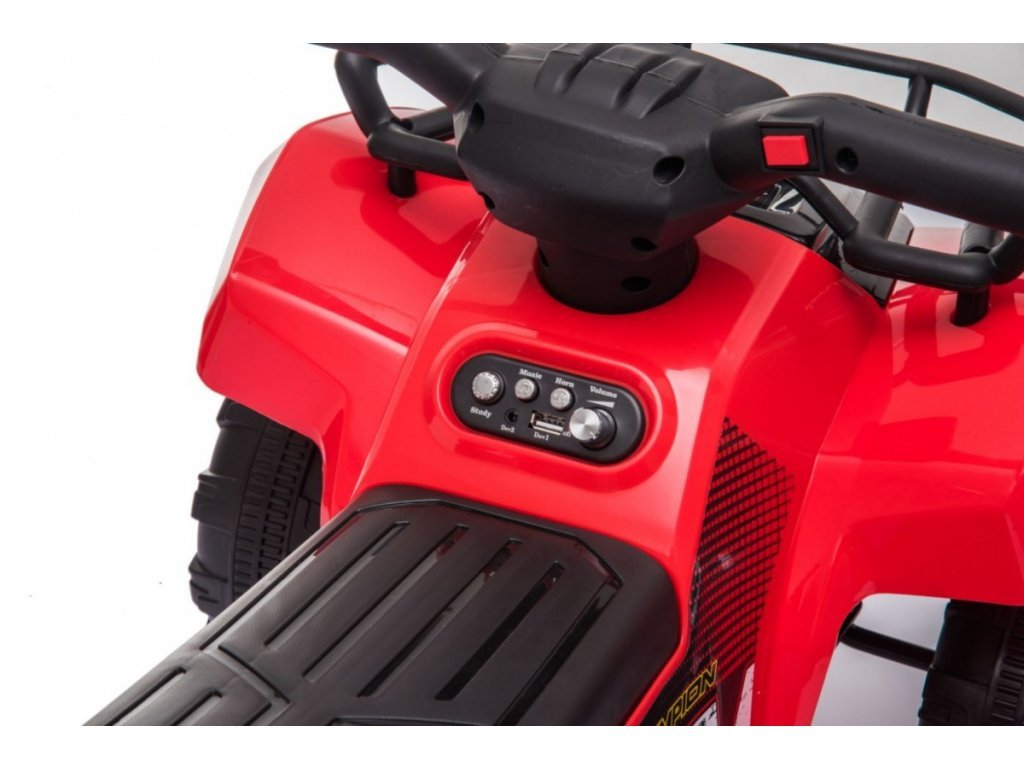 Kinder-Quad Storm ist größenmäßig für Kinder von 1,5 bis 3 Jahren geeignet, seine maximale Tragfähigkeit beträgt 20 kg. Es hat einen bequem geformten Sitz, breite Räder und Sound- und Lichteffekte. Das Musikpanel ist mit einem AUX-, USB-Eingang und vorab aufgenommenen Melodien ausgestattet. Das Kind kann sich mit den vorderen LED-Leuchten den Weg beleuchten.