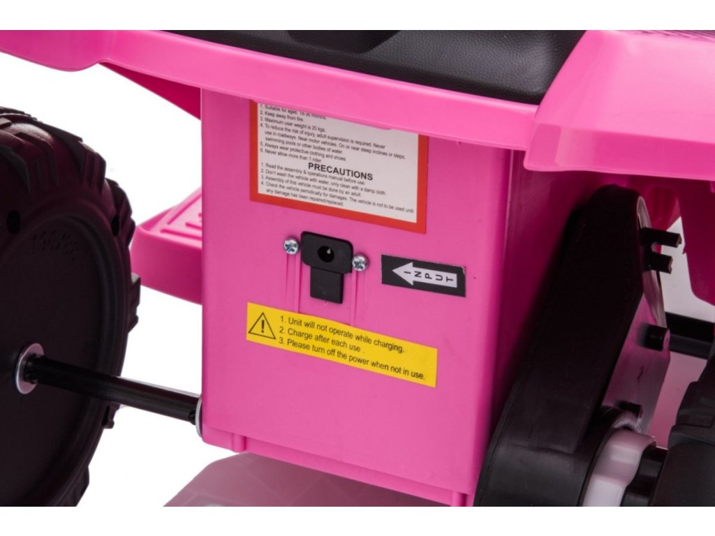 Kinder-Quad Storm ist größenmäßig für Kinder von 1,5 bis 3 Jahren geeignet, seine maximale Tragfähigkeit beträgt 20 kg. Es hat einen bequem geformten Sitz, breite Räder und Sound- und Lichteffekte. Das Musikpanel ist mit einem AUX-, USB-Eingang und vorab aufgenommenen Melodien ausgestattet. Das Kind kann sich mit den vorderen LED-Leuchten den Weg beleuchten.
