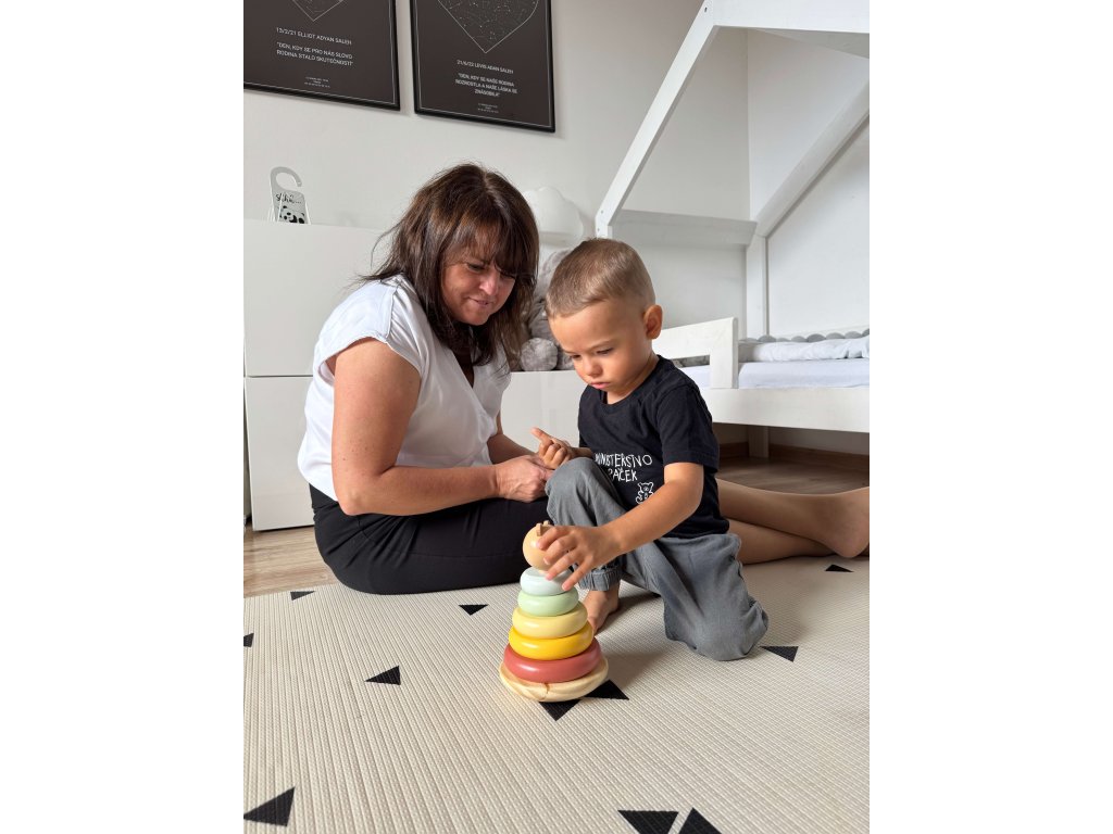 Wir stellen vor Holz-Stapelpyramide - Bär, ideal für Kinder ab 12 Monaten. Dieses entzückende Stapelspielzeug wurde entwickelt, um die Feinmotorik, die Hand-Auge-Koordination und die Farberkennung zu fördern. Das Spielzeug besteht aus bunten Ringen, die auf eine Basis mit einem lächelnden Bären an der Spitze gesteckt werden können. Hergestellt aus sicheren und umweltfreundlichen Materialien, ist dieses Spielzeug sanft zur Kinderhaut und langlebig.