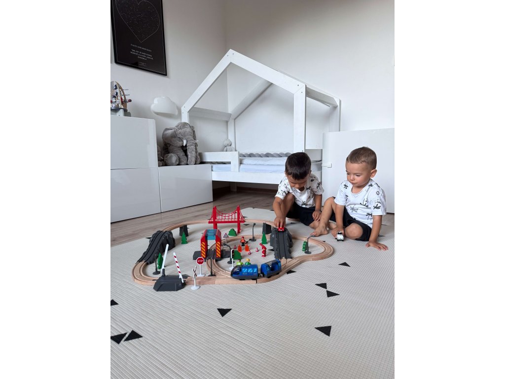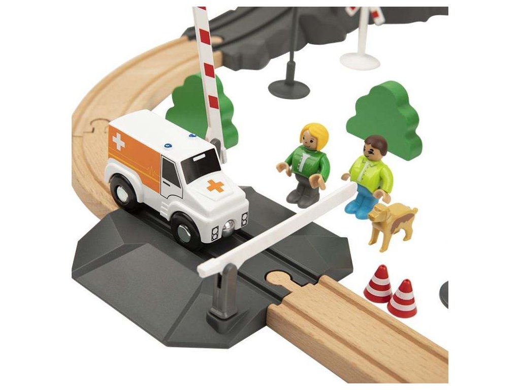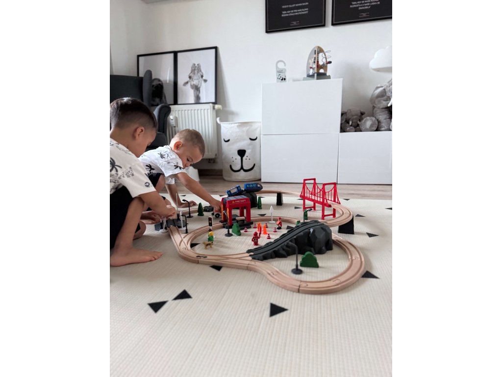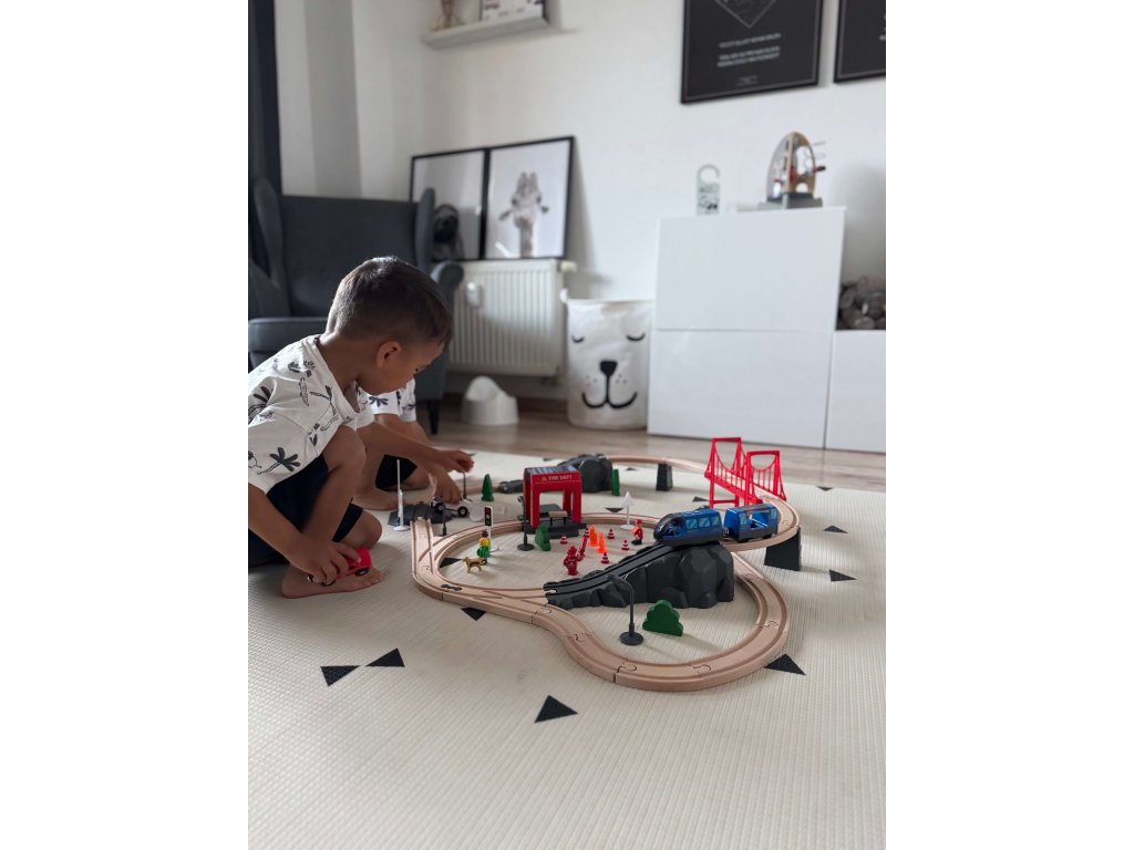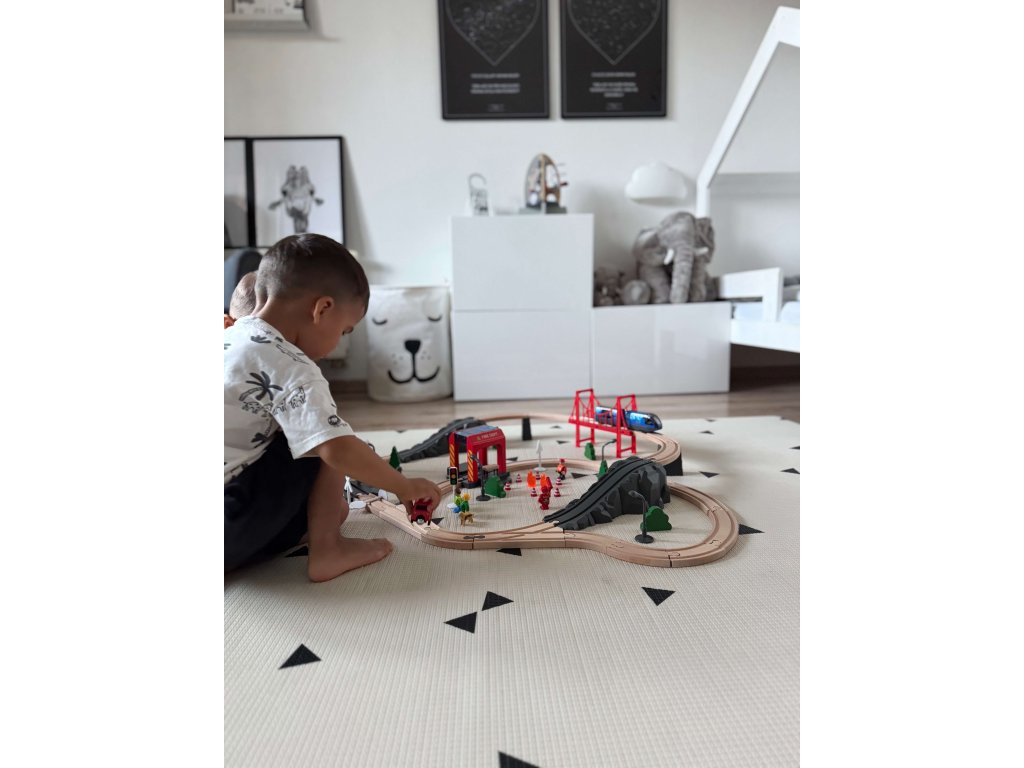 Erlebe ein actionreiches Abenteuer mit der Holzeisenbahn - Feuerwehr, ideal für Kinder ab 3 Jahren. Dieses Set enthält 70 Teile, darunter Züge, Schienen, eine Feuerwache, eine Brücke, einen Tunnel und weiteres Zubehör. Das Spielzeug fördert kreatives Spielen, Feinmotorik und Hand-Auge-Koordination. Hergestellt aus sicheren und umweltfreundlichen Materialien, ist das Set langlebig und sanft zur Kinderhaut.
