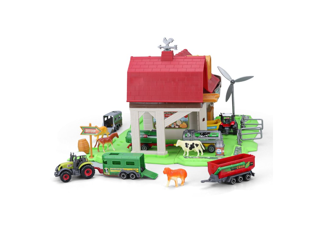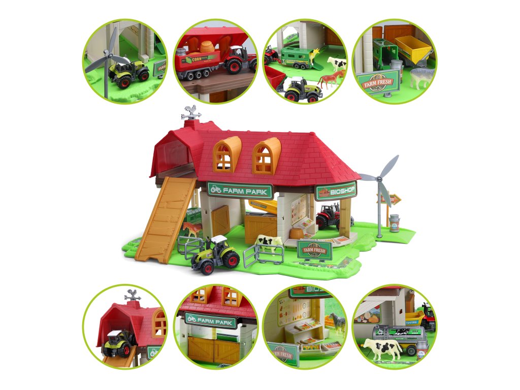 - Realistisches Design: Der Bauernhof ist mit allen notwendigen Elementen ausgestattet, darunter eine Scheune, eine Windmühle, Traktoren, Anhänger und kleine Tiere, die Kindern ein authentisches Bauernhoferlebnis bieten.