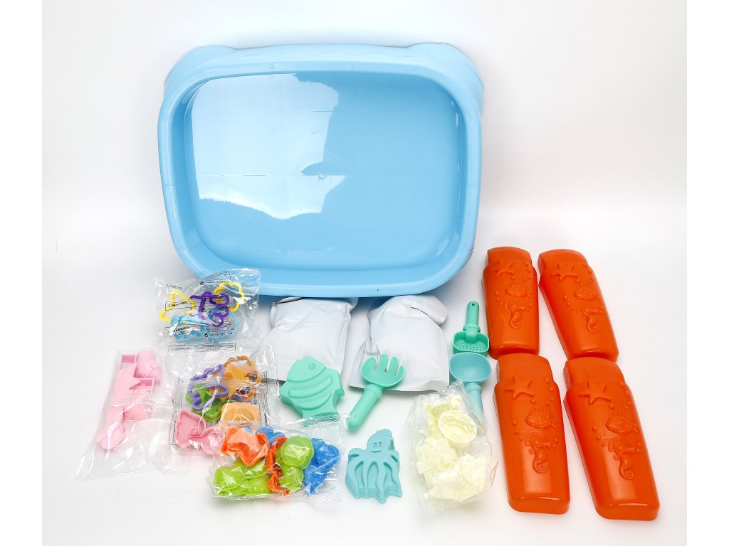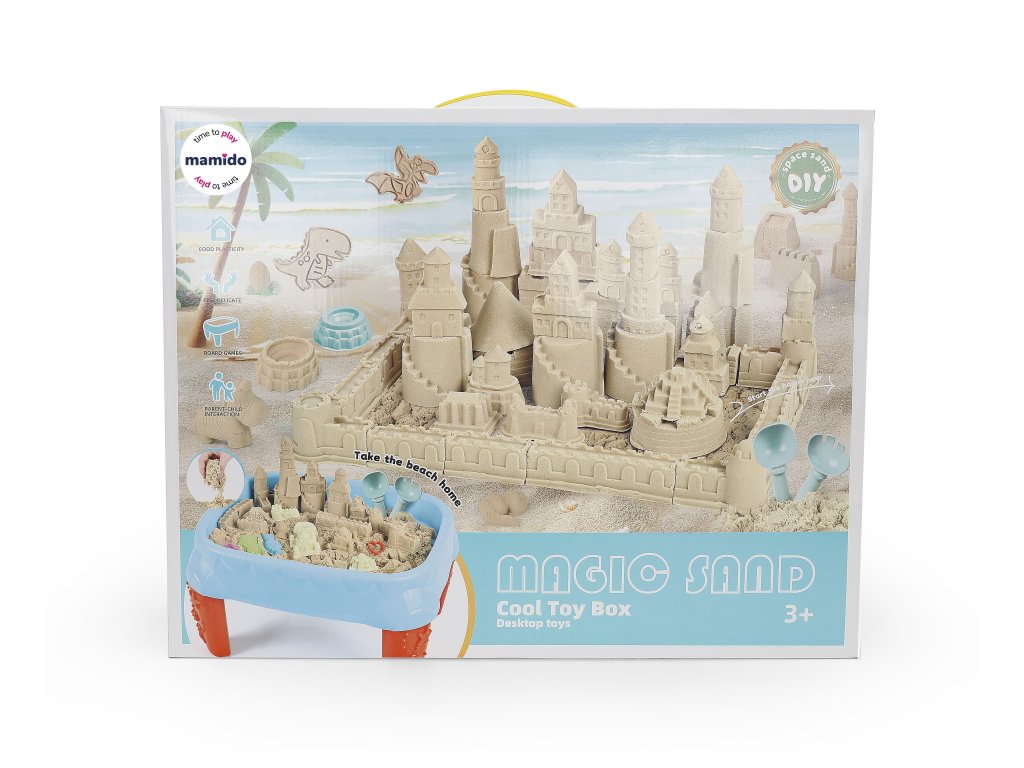 Das Paket enthält reichlich Zubehör – bunte Förmchen in Tierform, Schaufeln, Harken und ein Tisch zum Bauen. Dank der verschiedenen Sandfarben können Kinder noch lustigere und buntere Kreationen erschaffen. Das Set ist für den Innen- und Außenbereich geeignet, da der Sand nicht verschüttet und leicht zu reinigen ist.
