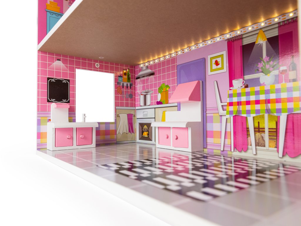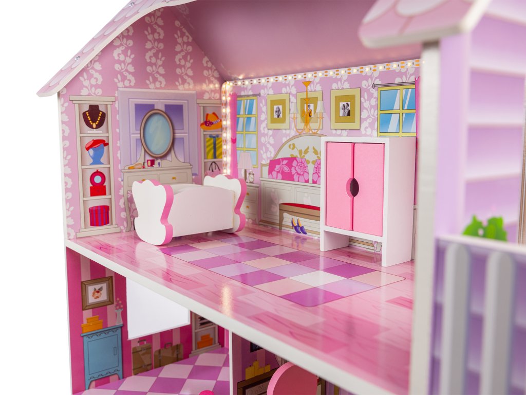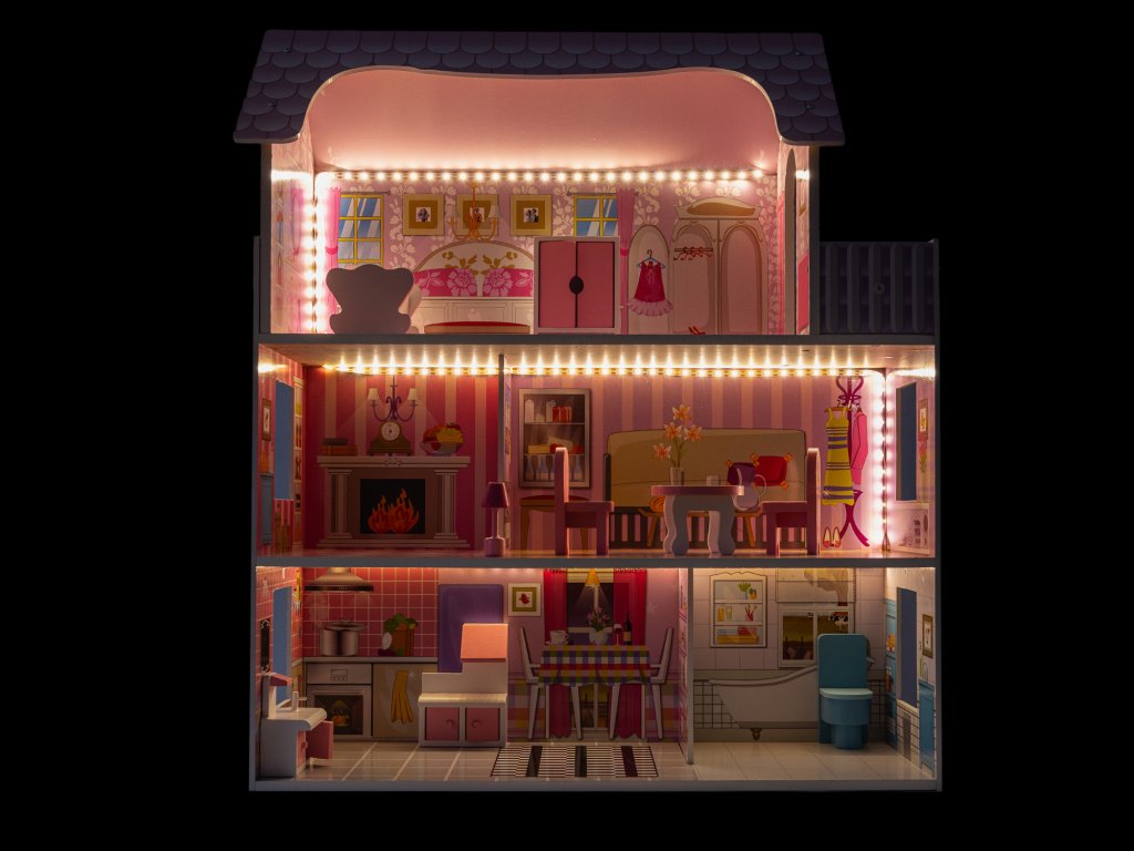 Dreistöckiges Holzpuppenhaus Tilli 70cm + LED-Beleuchtung 8 Möbelstücke