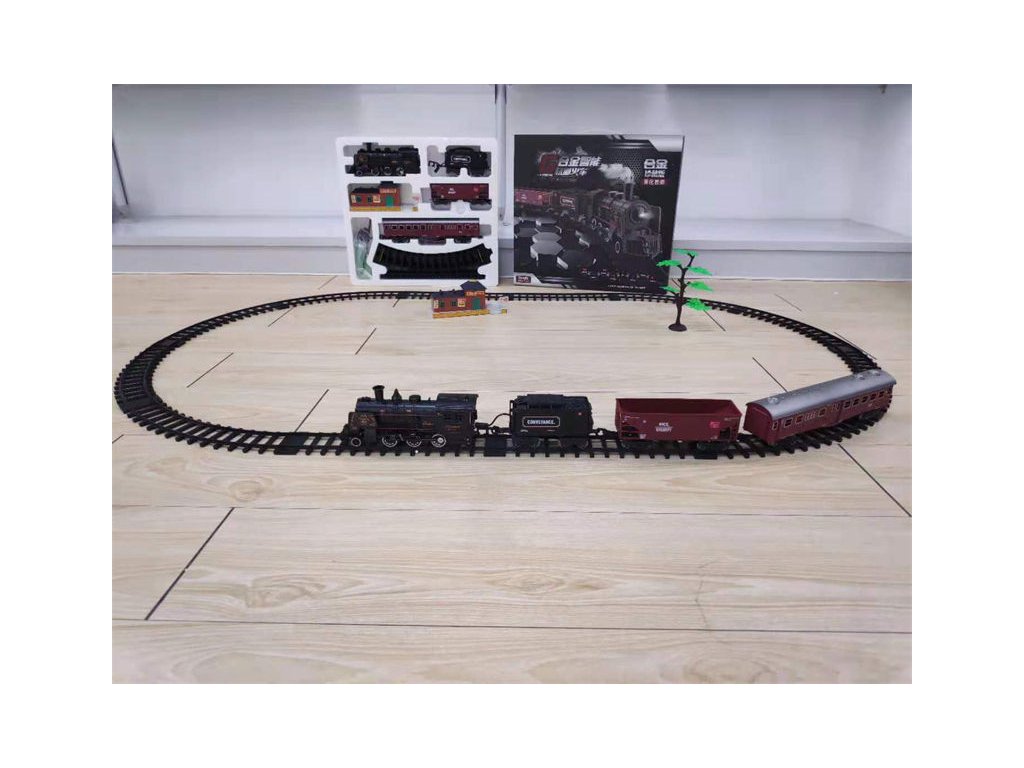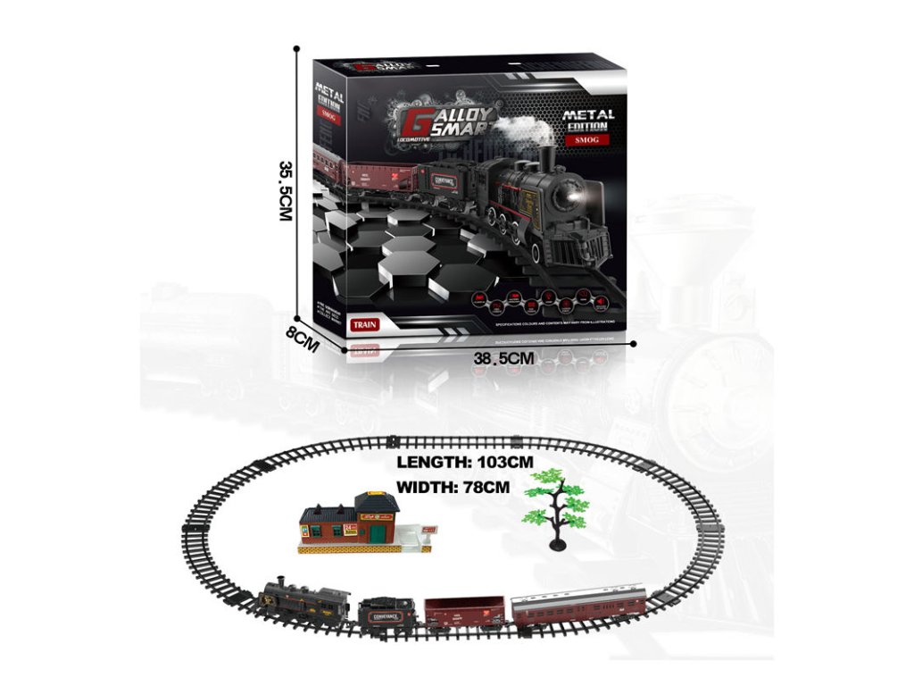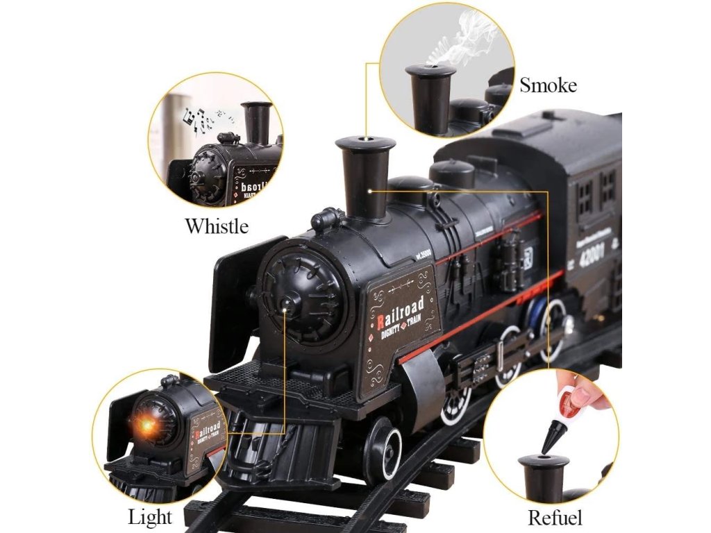 Dampfeisenbahn mit realistischen Geräuschen. Lokomotive stößt während der Fahrt Rauch aus dem Schornstein aus (um Dampf zu erzeugen, tropfen Sie zuerst Wasser in die Lokomotive, ein Tropfer ist im Set enthalten). Während der Fahrt leuchtet das Vorderlicht der Lokomotive auf. Die Strecke hat die Form einer Ellipse mit den Maßen 143 x 106 cm.