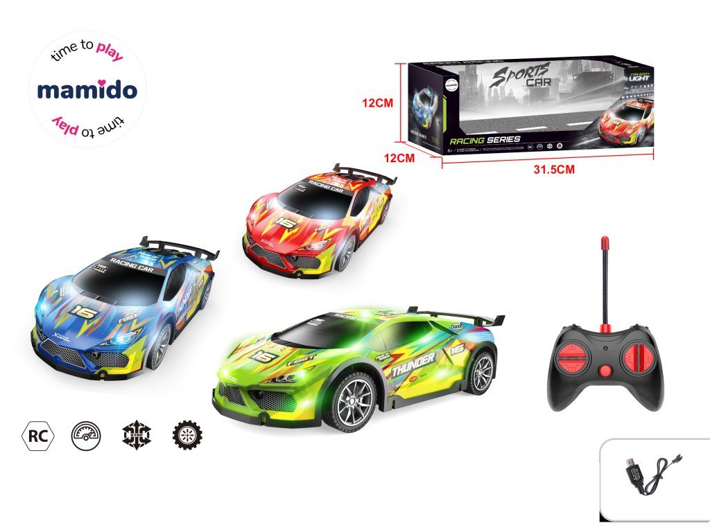 Sportliches RC-Auto im Maßstab 1:16 begeistert jeden kleinen Rennfahrer. Dank einfacher Bedienung bewegt es sich vorwärts, rückwärts, nach links und rechts und verfügt über Lichteffekte, die dem Fahren einen echten Rennsport-Touch verleihen. Das Auto hat ein attraktives Design im Rennstil und ist in mehreren Farbvarianten erhältlich.