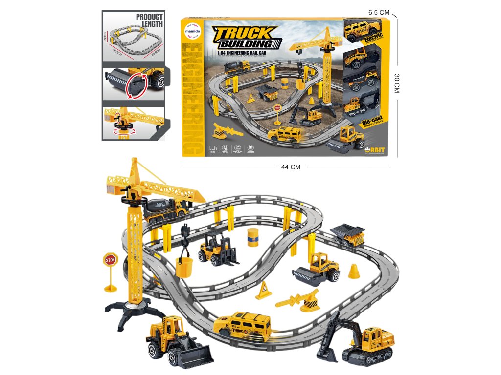 Velká stavební sada s drahou nabízí dětem hodiny kreativní zábavy. Set obsahuje elektrické auto, 3 kovové stavební stroje, pohyblivý jeřáb a dopravní značení. Díky propracovaným detailům působí jako skutečné staveniště a podporuje rozvoj fantazie i jemné motoriky dětí.