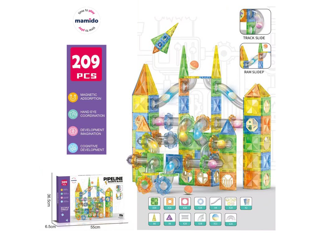 Objevte nekonečné možnosti tvoření s magnetickou stavebnicí Pipeline o 209 dílcích, která kombinuje klasické magnetické bloky s úžasnou kuličkovou dráhou! Děti mohou stavět barevné věže, mosty, skluzavky a tunely, po kterých se kuličky svižně kutálejí.