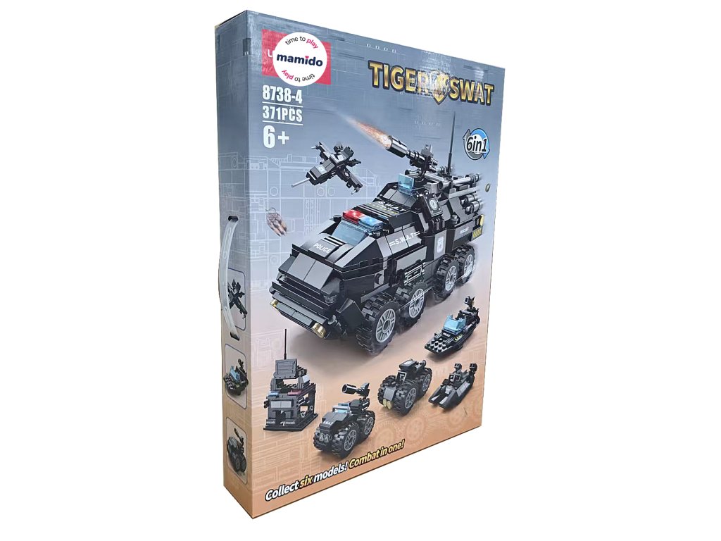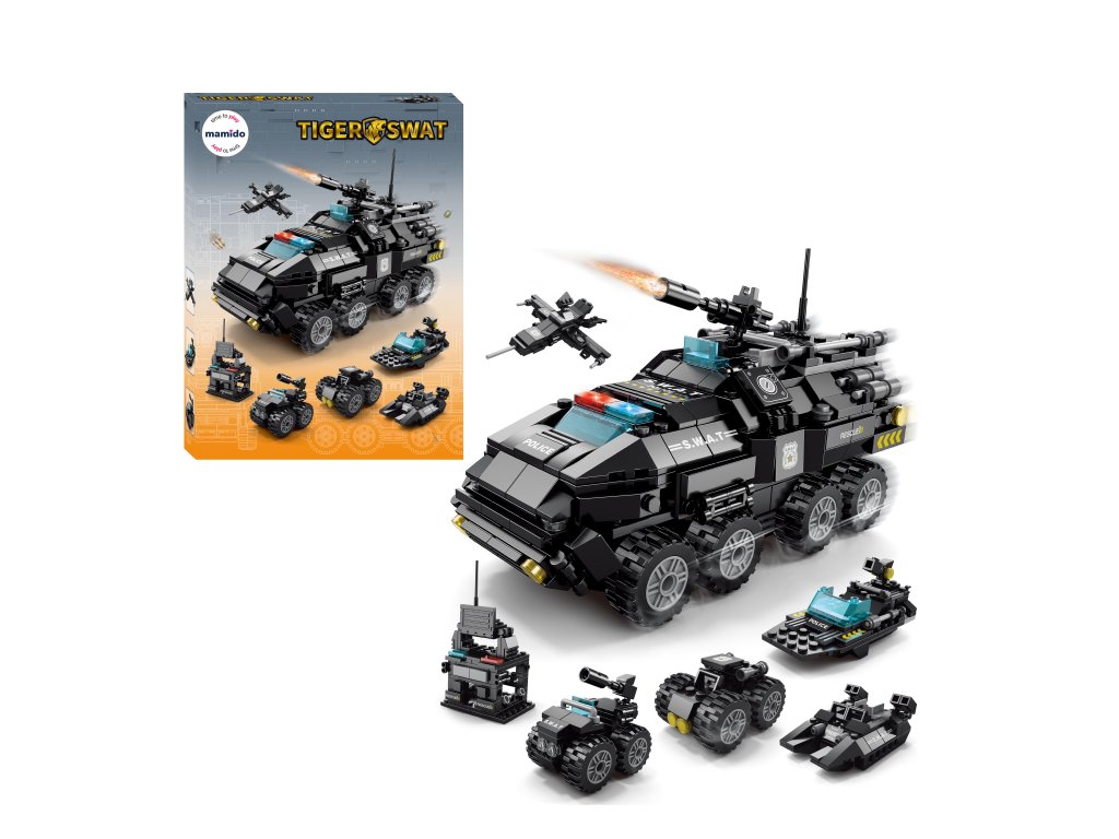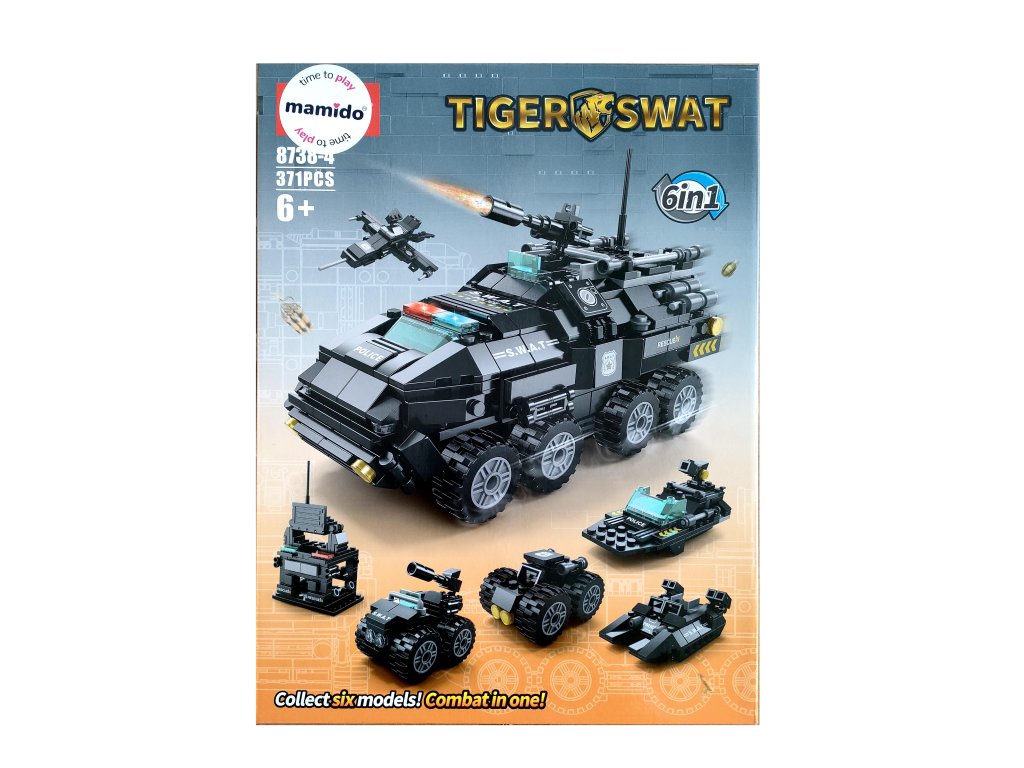 Das Set SWAT Tiger 6in1 bietet unendlichen Spaß und actionreiche Abenteuer. Aus 371 Teilen lassen sich sechs verschiedene Modelle bauen – vom gepanzerten Fahrzeug mit drehbarem Turm über einen kleinen Panzer bis hin zu einem Aufklärungsflugzeug oder einem Polizeiboot.