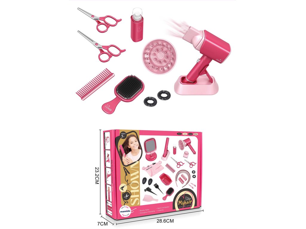 - Obsahuje: fén se zvukem a světlem, nůžky, hřebeny, lahvičku, gumičky a další doplňky