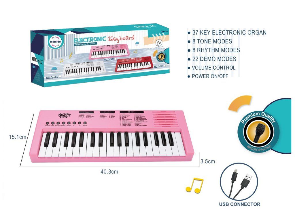 Entdecke die Welt der Musik mit diesem 40 cm langen Kinderkeyboard, das eine ausgezeichnete Wahl für kleine angehende Musiker ist. Das Keyboard verfügt über 37 Tasten, 8 Tonmodi, 8 Rhythmen und 22 Demo-Songs, die helfen, das musikalische Gehör und die Kreativität zu entwickeln. Die Bedienung ist einfach über die roten Tasten auf dem Bedienfeld, wo Kinder den Ton, die Lautstärke einstellen, Begleitungen starten oder verschiedene Musikstile ausprobieren können. Die Stromversorgung erfolgt über das mitgelieferte USB-Kabel, sodass keine Batterien gekauft werden müssen.
