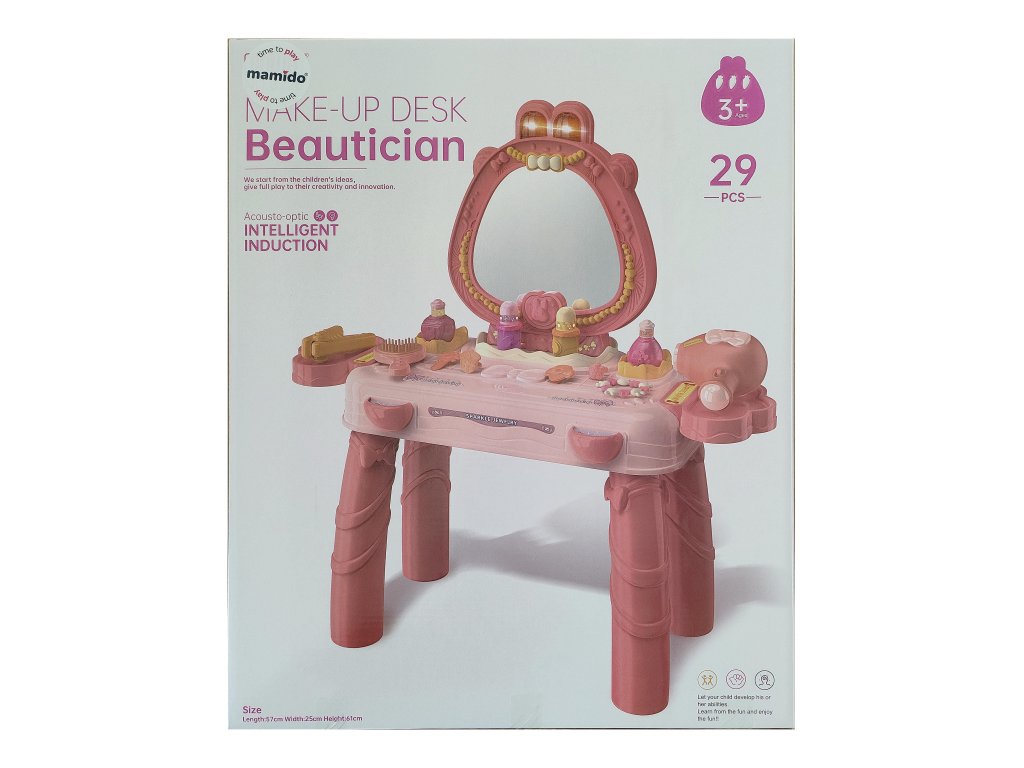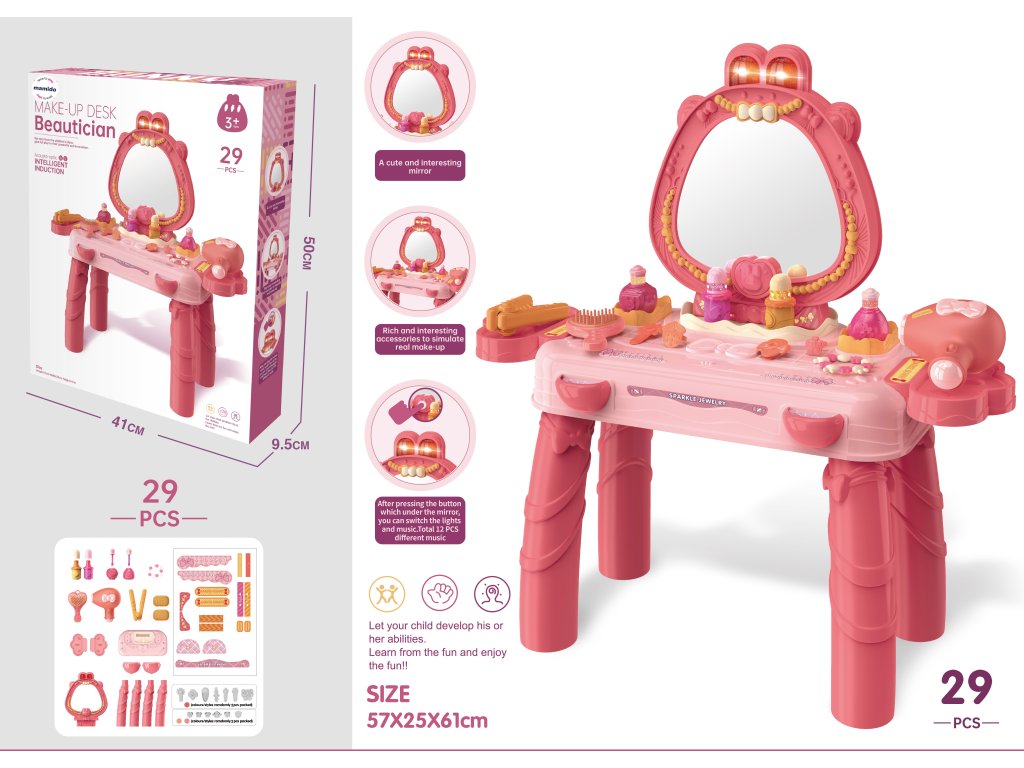 Dětský kosmetický stolek je ideální hračkou pro malé parádnice od 3 let. Součástí je 29 dílů příslušenství, mezi nimiž najdete lahvičky, hřebínky, rtěnky a další doplňky pro hraní na opravdovou vizážistku. Stolek je vybaven zrcadlem se světelnými efekty a hudbou, které se aktivují stiskem tlačítka pod zrcadlem. Děti si mohou hrát na kadeřnice či kosmetičky a rozvíjet svou fantazii i tvořivost.