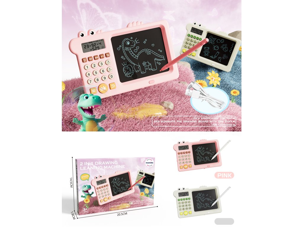 Spaß und Lernen in einem! Der bunte Dinosaurier-Schreibtablet ist das ideale Hilfsmittel zur Entwicklung der kindlichen Fantasie und grundlegender Fähigkeiten. Dank des LCD-Bildschirms können Sie einfach zeichnen, schreiben oder rechnen und alles mit einem Knopfdruck löschen. Der eingebaute Taschenrechner hilft bei den ersten Beispielen, während die robuste Konstruktion und das praktische USB-Laden eine langfristige Nutzung ohne unnötige Batterien gewährleisten. Das Tablet ist leicht, einfach zu transportieren und ideal für das Lernen zu Hause, auf Reisen und in der Freizeit.