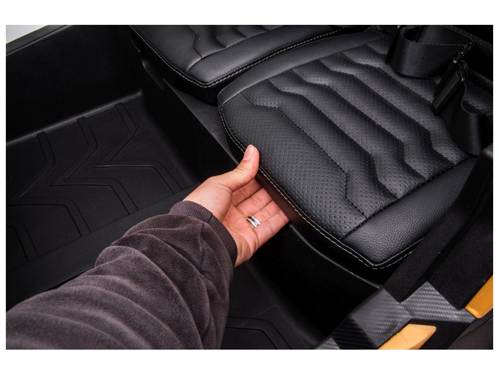 Zur Ausstattung des Elektroautos gehören vordere und hintere LED-Leuchten sowie ein Musikpanel mit Anschlüssen für MP3, AUX und USB. Beim Starten des Fahrzeugs hören Sie die Motorengeräusche. Sicherheitsgurte sorgen für eine sichere Fahrt. Die Fernbedienung arbeitet auf einer Frequenz von 2,4 GHz, verfügt über drei Geschwindigkeiten und eine Sicherheitstaste Stopp, die das Fahrzeug sofort stoppt und alle seine Funktionen ausschaltet.