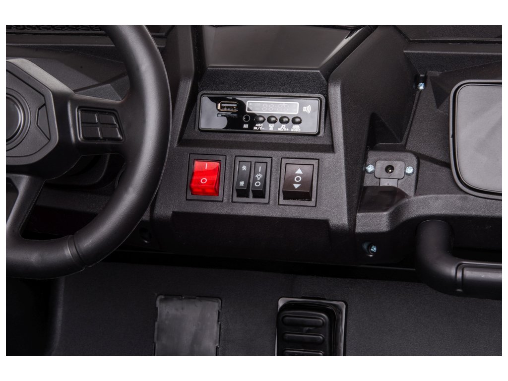 Zur Ausstattung des Elektroautos gehören vordere und hintere LED-Leuchten sowie ein Musikpanel mit Anschlüssen für MP3, AUX und USB. Beim Starten des Fahrzeugs hören Sie die Motorengeräusche. Sicherheitsgurte sorgen für eine sichere Fahrt. Die Fernbedienung arbeitet auf einer Frequenz von 2,4 GHz, verfügt über drei Geschwindigkeiten und eine Sicherheitstaste Stopp, die das Fahrzeug sofort stoppt und alle seine Funktionen ausschaltet.