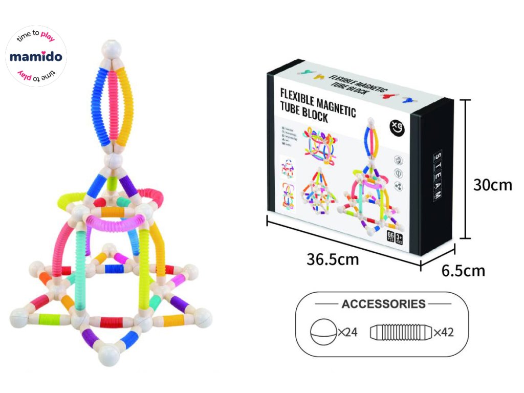 Kreativer Baukasten mit flexiblen Magnetröhrchen, der die Erstellung unbegrenzter 3D-Konstruktionen ermöglicht. Dank der Kombination aus flexiblen Röhrchen und Magnetverbindungen macht das Bauen nicht nur Spaß, sondern fördert auch technisches Denken, räumliche Vorstellungskraft und Feinmotorik.