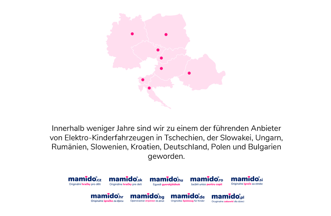 Die Firma Mamido wurde als Importeur und Händler von Spielzeug gegründet. Innerhalb weniger Jahre sind wir zu einem der führenden Importeure von Elektrofahrzeugen auf dem tschechischen, slowakischen und ungarischen Markt geworden. Schrittweise haben wir unser Sortiment auch um Holz-, Plastik- und Plüschspielzeug sowie weitere Artikel erweitert. Während unserer gesamten Tätigkeit wählen wir Produkte aus, die sich durch Qualität auszeichnen, vor allem aber durch die Fähigkeit, die Persönlichkeit des Kindes zu entwickeln.