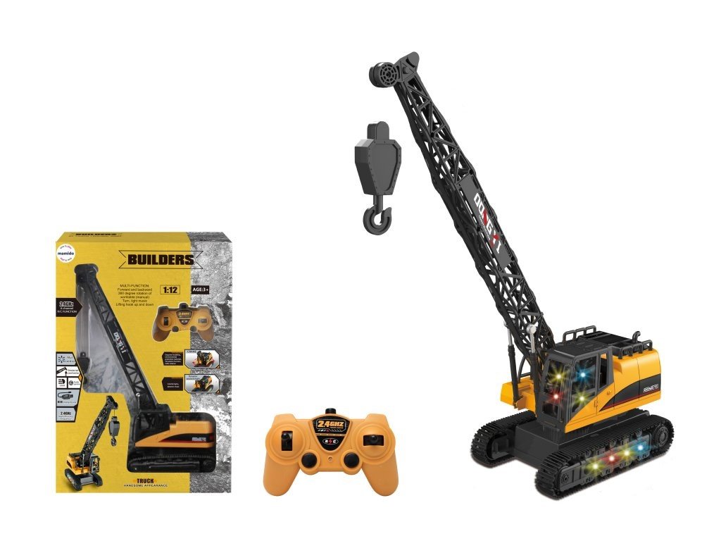 Robuster RC-Kran im Maßstab 1:12 wird alle kleinen Baumeister begeistern. Das Modell ist mit einem Kettenlaufwerk ausgestattet, das es ihm ermöglicht, sich vorwärts und rückwärts zu bewegen und sich leicht zu drehen. Der Kran ermöglicht eine manuelle 360°-Drehung und dank der Fernbedienung kann der Haken angehoben und abgesenkt werden. Für ein noch realistischeres Erlebnis ist er mit bunten Lichtern und Soundeffekten ausgestattet. Das Aufladen ist einfach über ein USB-Kabel möglich.