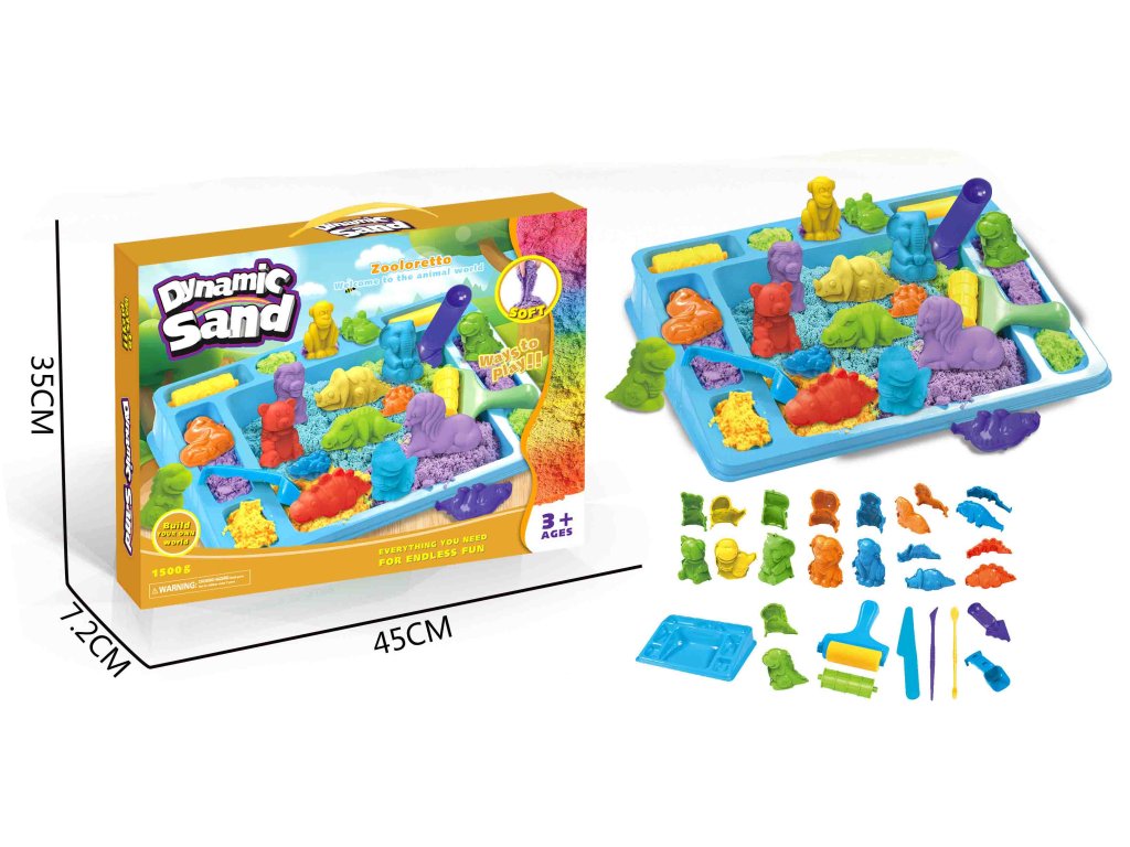 Tato bohatá sada obsahuje barevný písek, díky kterému si děti mohou vytvořit vlastní zoo plnou zvířat. Písek je příjemný na dotek, měkký a skvěle drží tvar – ideální pro modelování a tvoření. Součástí balení jsou různé formičky zvířat, nástroje a tác, takže děti mohou tvořit podle vlastní fantazie a procvičovat jemnou motoriku i tvořivost.