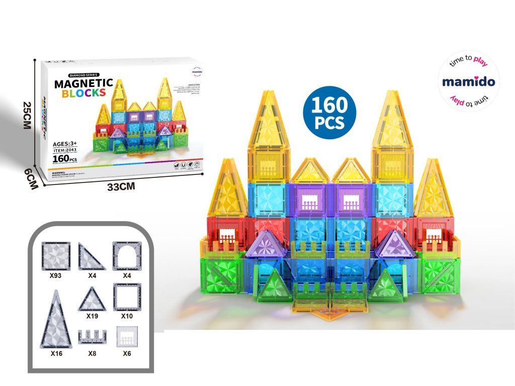 Entdecken Sie endlose Kreationsmöglichkeiten mit dem 160-teiligen Magnetbaukasten. Die bunten, transparenten Bausteine mit Diamantoberfläche lassen sich dank starker Magnete leicht verbinden und ermöglichen den Bau hoher Burgen, Brücken, Türme und Fahrzeuge. Kinder entwickeln beim Spielen Kreativität, räumliche Vorstellungskraft und Feinmotorik.