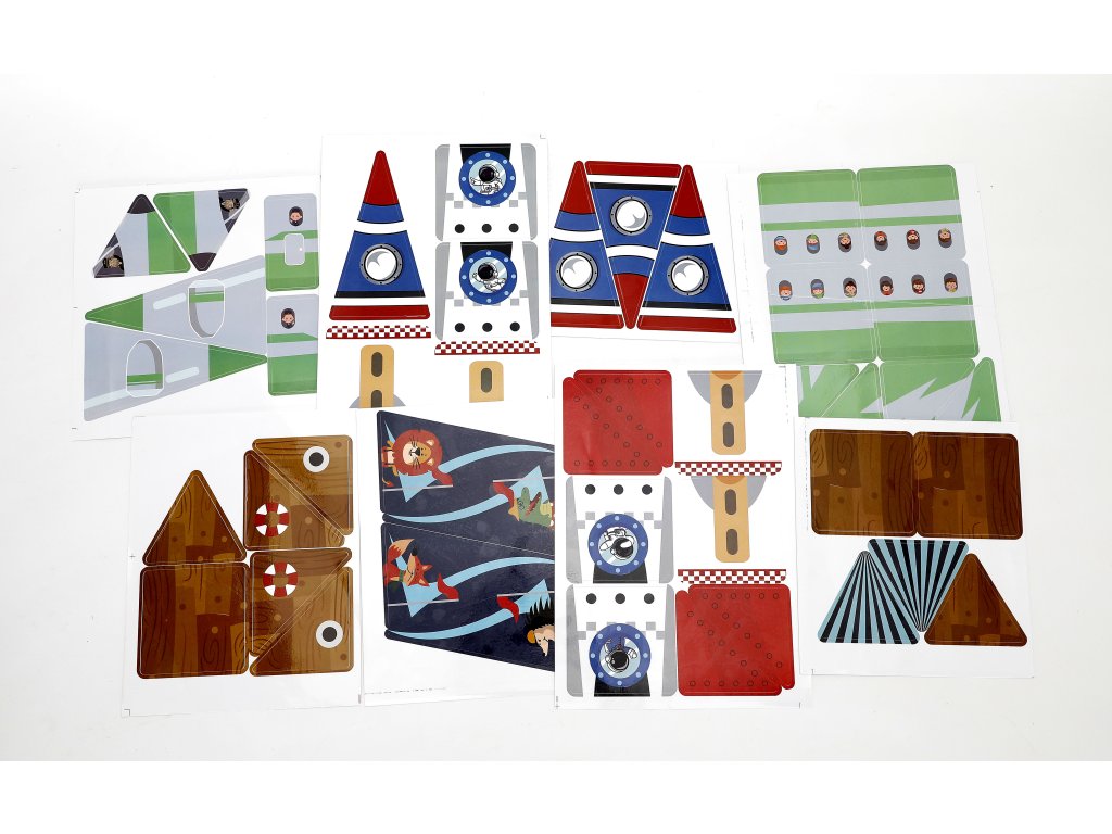 Das Set enthält Grundteile + bedruckte doppelseitige Dekorationen, die auf die Magnete gesetzt werden können, um Motive von Schiffen, Flugzeugen, Raketen, Türmen und anderen thematischen Bauwerken zu erstellen.