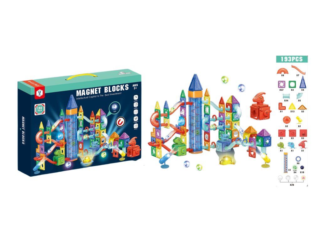 Entdecken Sie unendliche Kreationsmöglichkeiten mit dem 193-teiligen Magnetbaukasten, der Bauen und Actionspaß vereint! Kinder können bunte Türme, Tunnel und Murmelbahnen bauen, auf denen die Kugeln rollen.