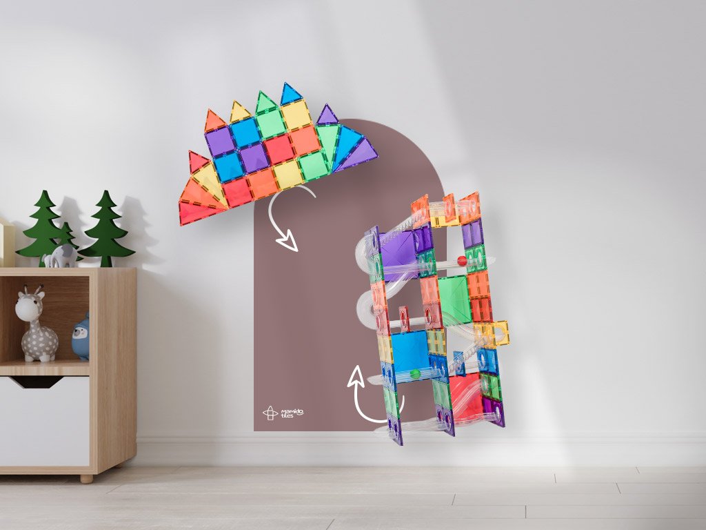 Die magnetische Tapete Mamido Tiles bringt Kindern dank ihrer magnetischen Kraft und einfachen Installation noch mehr Spaß, Kreativität und Lernerlebnisse. Einfach an eine glatte Wand kleben und im Handumdrehen entsteht ein interaktiver Bereich für Magnete, Kreidezeichnungen, Malereien mit abwaschbaren Farben und Schreiben mit Whiteboard-Stiften.