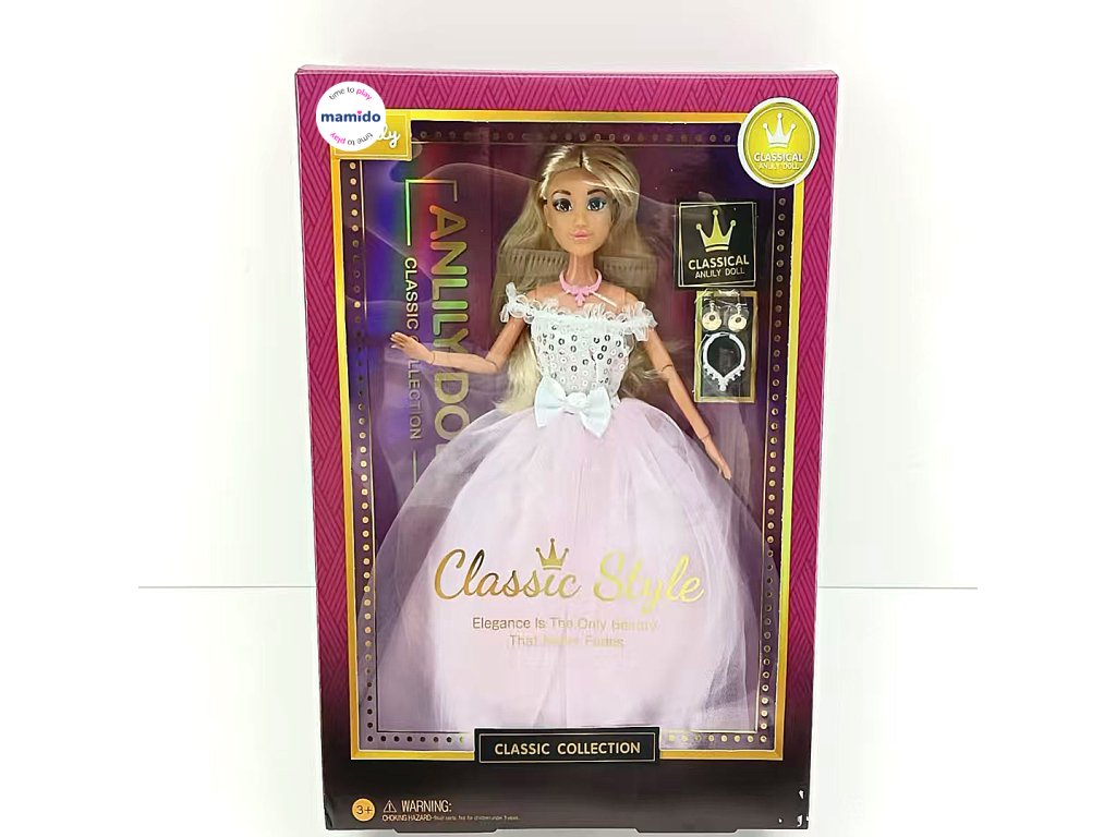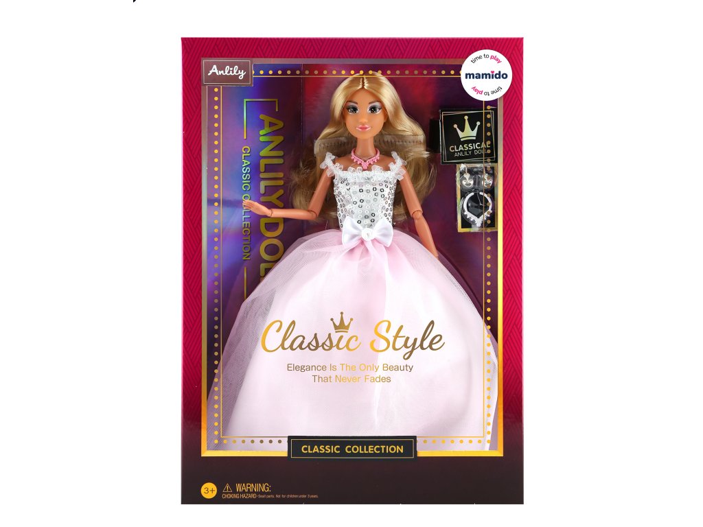 Elegantní panenka Anlily z edice Classic Style okouzlí všechny malé princezny svými nádhernými šaty v kombinaci bílé a růžové barvy. Živůtek je zdoben flitry a mašlí, zatímco bohatá tylová sukně působí slavnostně a pohádkově. Panenka měří 29 cm (11,5 inch), má dlouhé vlasy a pohyblivé končetiny.