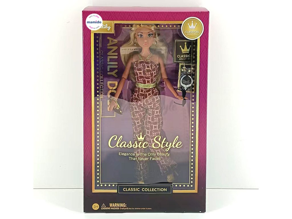 Objev kouzlo elegance s panenkou Anlily Classic Style ve velikosti 29 cm. Panenka s hnědou pletí je oblečena do moderního overalu s originálním vzorem, zlatým páskem a stylovými doplňky. Součástí balení je kabelka a sada šperků, které dodají hře nádech luxusu a kreativity. Perfektní volba pro malé milovnice módy a sběratelky.