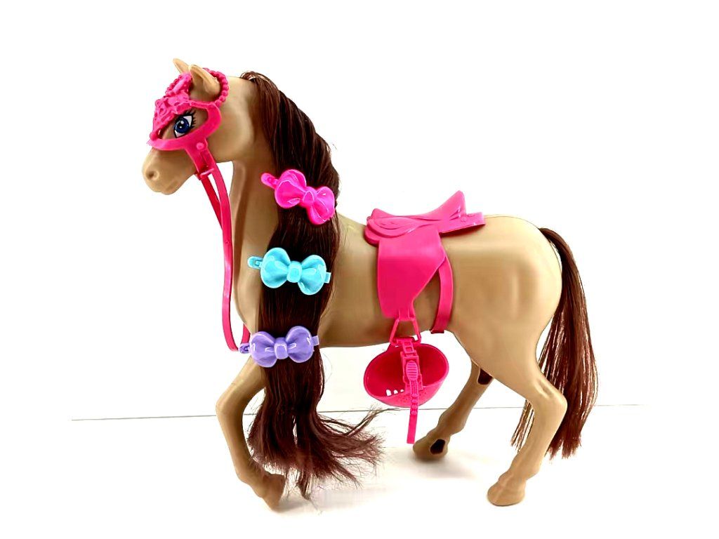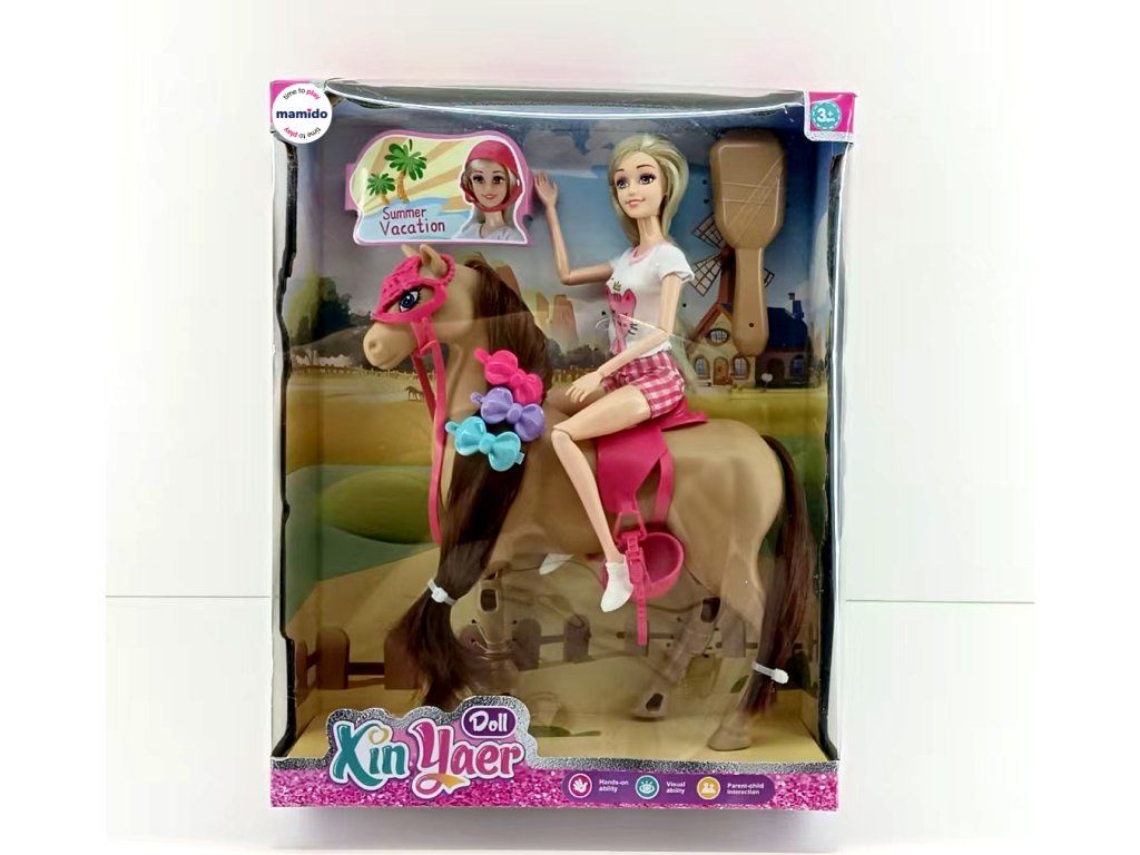 Dieses Reitset mit Puppe und Pferd bietet Kindern ein einzigartiges Erlebnis voller Fantasie und kreativem Spiel. Die schöne Puppe, gekleidet in einem Sommer-Outfit, kann einen Ausritt auf einem eleganten braunen Pferd mit langer Mähne und Schweif unternehmen, die gekämmt und mit bunten Schleifen geschmückt werden können. Dank des mitgelieferten Kamms können sich Kinder wie um ein echtes Pferd kümmern und so ihre Feinmotorik und ihre Fürsorgefähigkeiten entwickeln.
