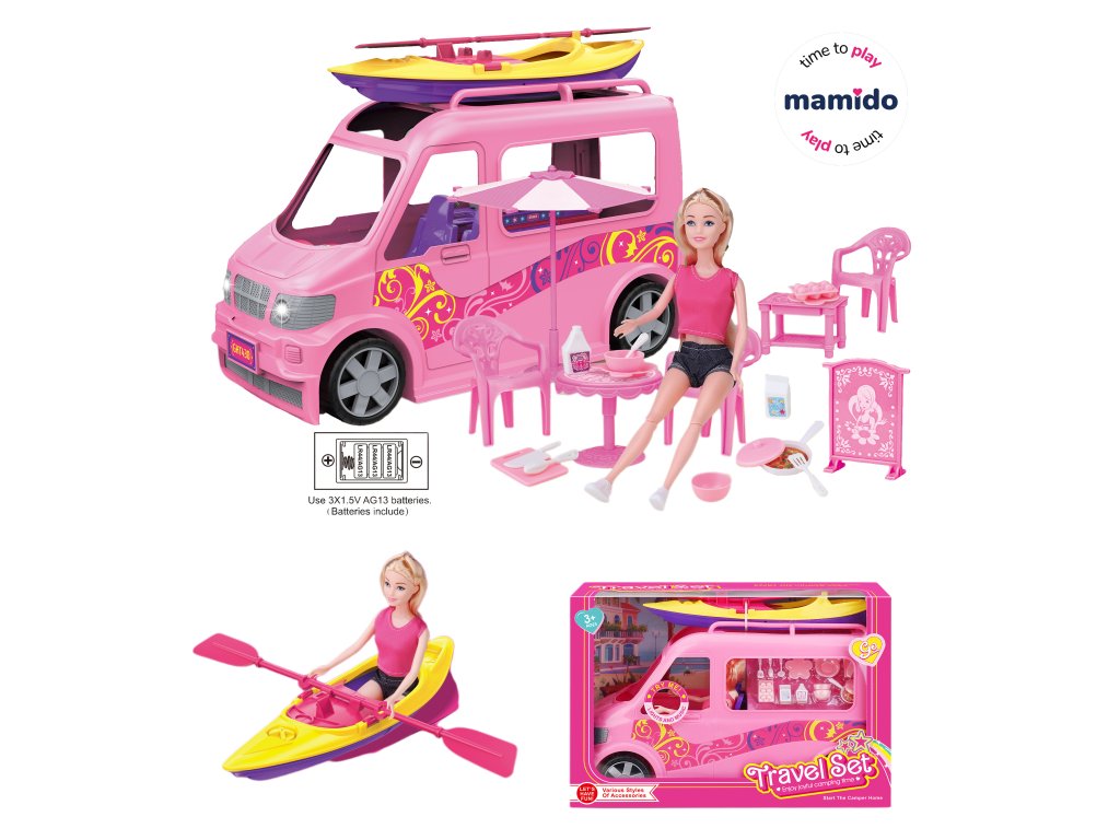 Užij si dokonalé dobrodružství s krásnou panenkou a jejím růžovým obytným autem! Set nabízí vše pro zábavné cestování – od kajaku pro vodní radovánky až po posezení s nábytkem a drobnými doplňky. Obytný vůz navíc vydává světelné a hudební efekty, což hru činí ještě zábavnější a realističtější.