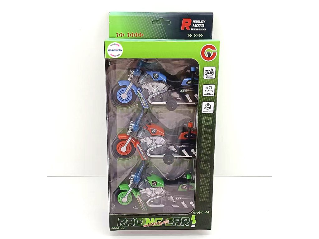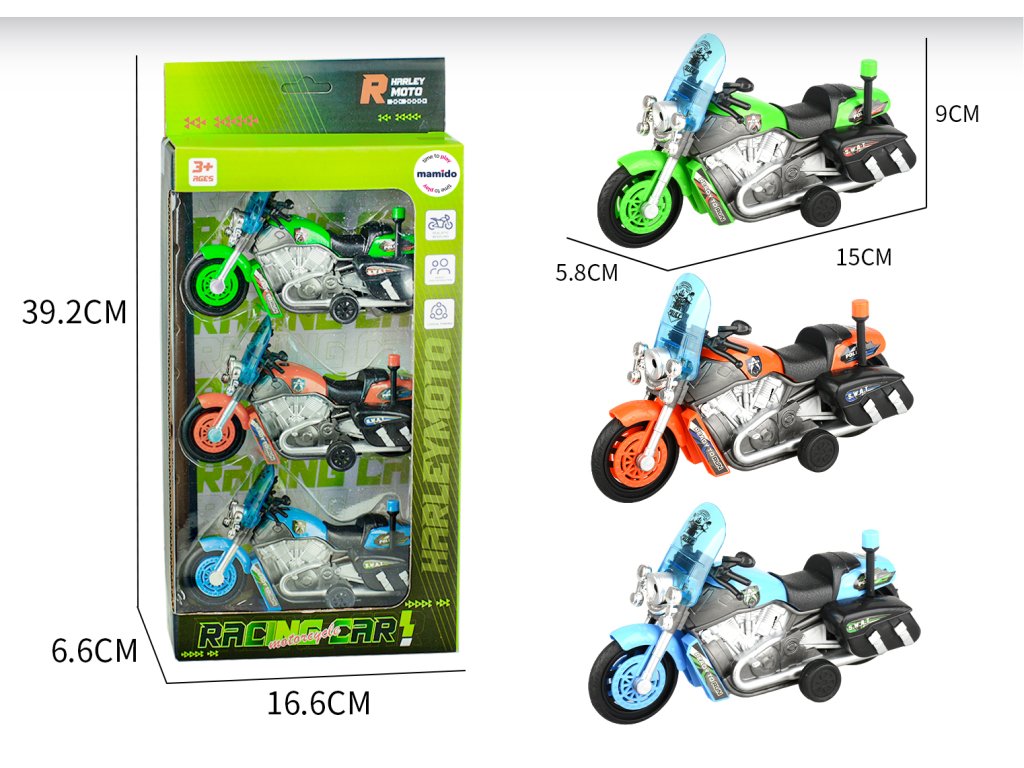 Stylisches Set aus drei Polizeimotorrädern mit Pull-Back-Antrieb (zurückziehen und loslassen) ist ein tolles Spielzeug für kleine Motorradfahrer. Die Motorräder haben einen Schutzschild, eine Sirene und Koffer, sodass sie wie echte Polizeimaschinen aussehen. Sie sind in attraktiven Farben erhältlich – Grün, Orange und Blau.