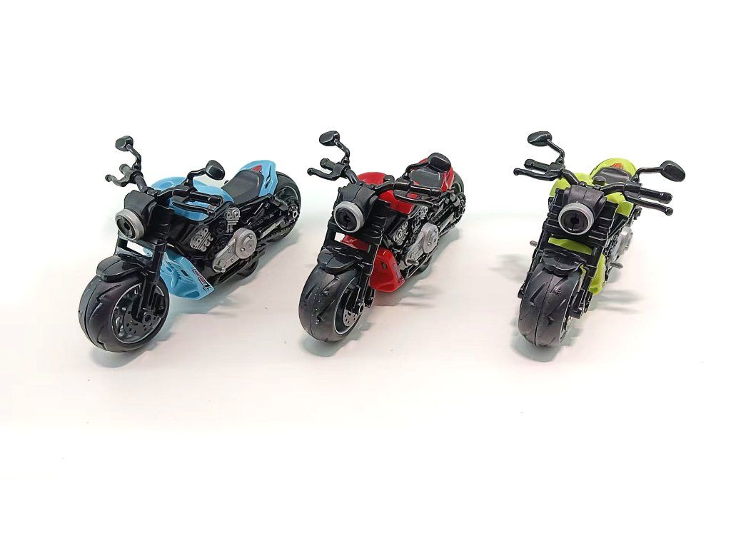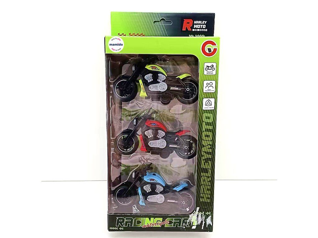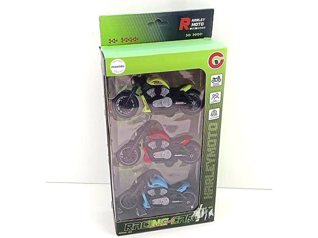 Stilvolles Set aus drei Rennmotorrädern mit Pull-Back-Antrieb (zurückziehen und loslassen) wird alle kleinen Fans des schnellen Fahrens begeistern. Die Motorräder haben ein detailreich ausgearbeitetes Design, breite Reifen und attraktive Farben – Rot, Blau und Gelb. Dank ihrer praktischen Größe sind sie für das Spielen zu Hause und im Freien geeignet.