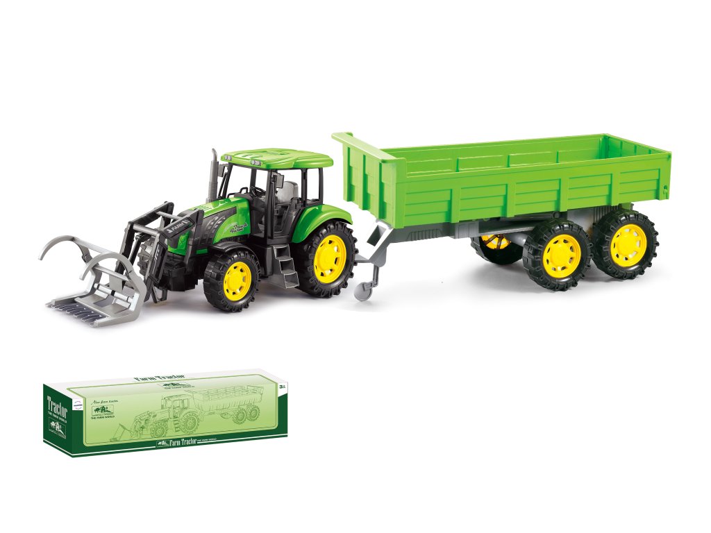 Traktor je vybaven předním nakladačem s pohyblivým ramenem a čelistí, díky kterému lze snadno nabírat a vykládat náklad. Součástí je i odnímatelná vlečka na čtyřech kolech, která se dá jednoduše zapojit za traktor. Díky výrazným barvám, detailnímu provedení a masivním pneumatikám působí hračka velmi realisticky a odolně. Podporuje dětskou fantazii, jemnou motoriku a kreativní hraní.