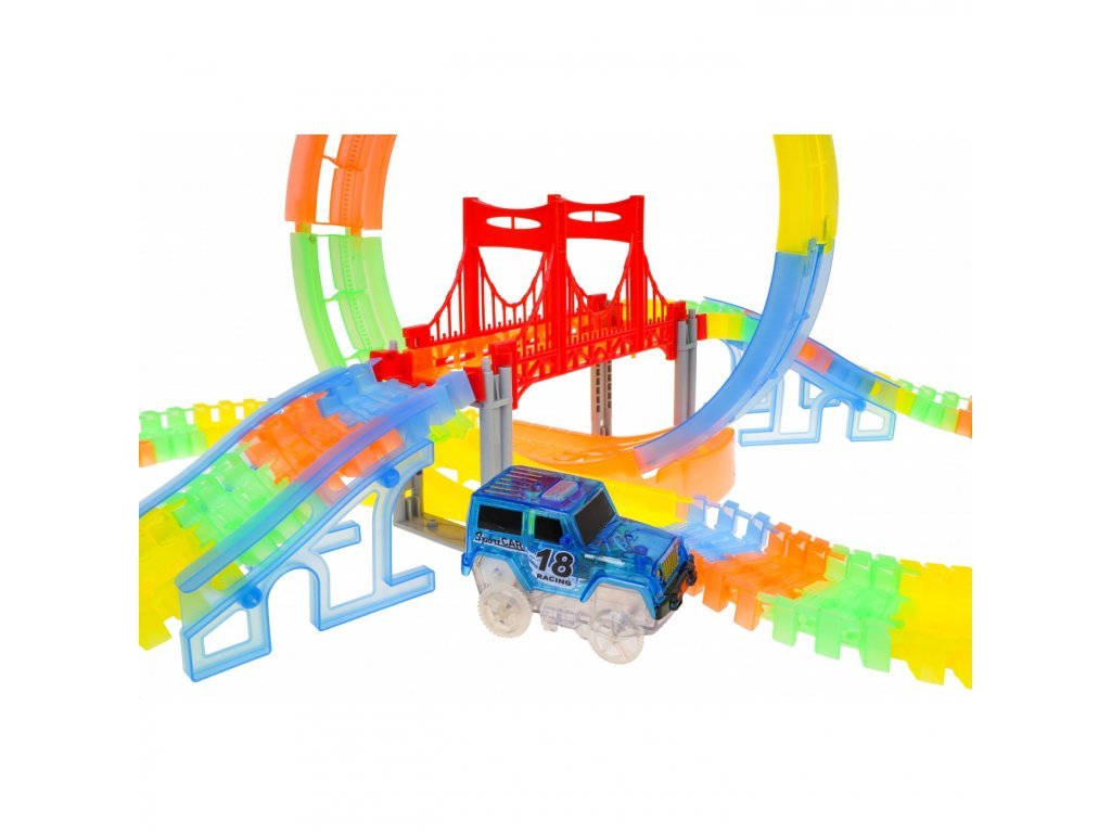 Die leuchtende Bahn mit Kreis und beiliegendem Auto ist ein tolles Geschenk für Kinder ab 3 Jahren. Die Bahnen sind flexibel, was verschiedene Kombinationen ermöglicht - Sie können sie drehen, heben, falten, sogar während der Fahrt des Autos. Außerdem sind die Bahnen fluoreszierend und leuchten im Dunkeln. Das Fahrzeug im Set hat eine LED-Beleuchtung, die während der Fahrt im Dunkeln einen atemberaubenden Effekt erzeugt. Das Auto wird mit 2 x AA 1,5V Batterien betrieben (nicht im Lieferumfang enthalten). Um das Auto zu starten, drücken Sie einfach den Knopf auf seinem Dach.