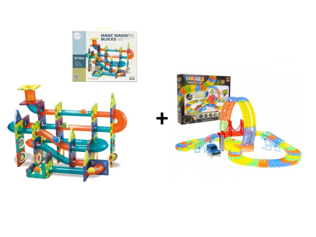 Vorteilhaftes Set Magnetbaukasten Murmelbahn 96 Teile + Leuchtende Autorennbahn variabel 157 Teile